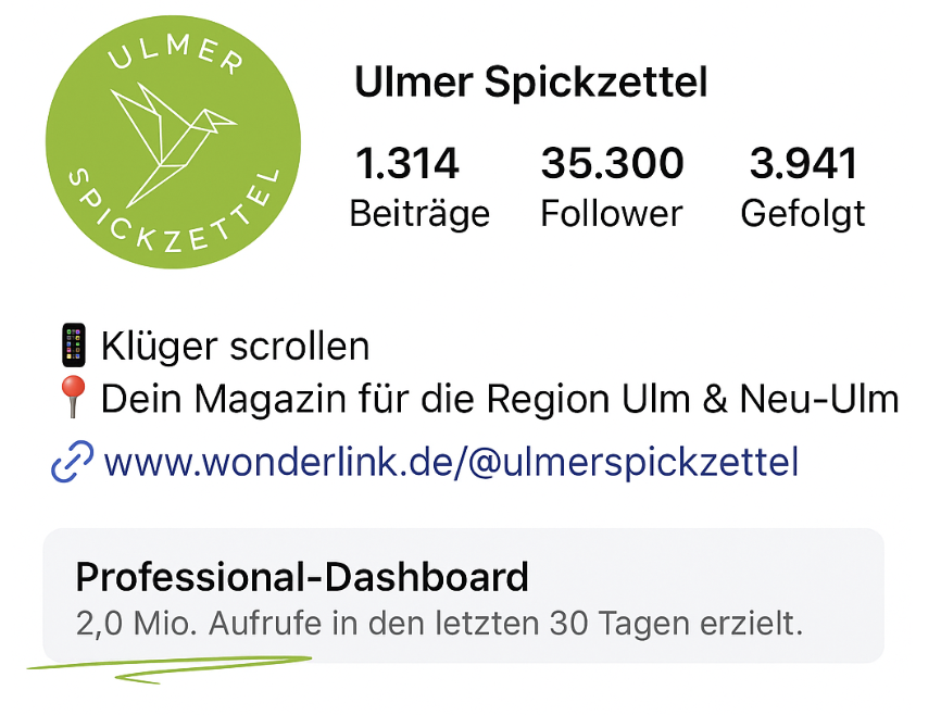 Der Ulmer Spickzettel erreicht monatlich über eine Million Aufrufe auf Instagram, Facebook und der eigenen Webseite. Rund 70 % unserer 53.000 Follower sind zwischen 17 und 50 Jahre alt.